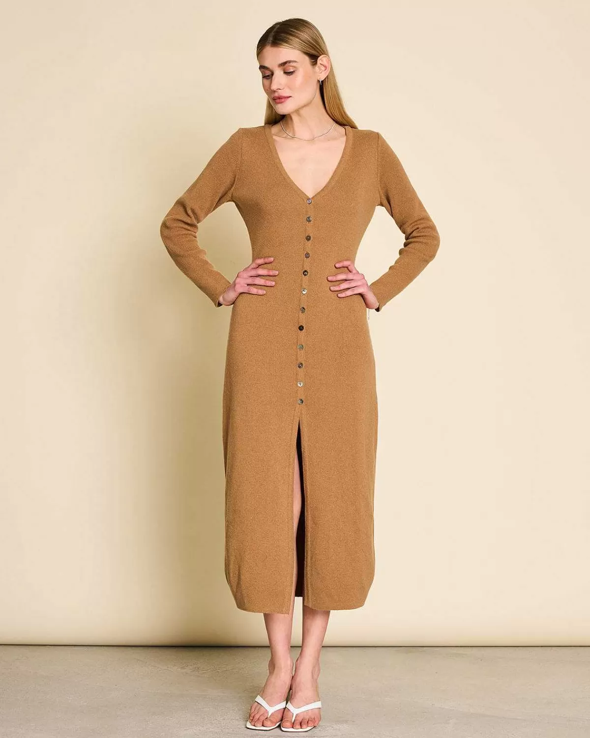 The Dress Has Long Sleeves And Body Hugging Fit. It Also Features A V-Neck And High Slit As Well As The Button Row In The Front. Thanks To Its Thin Knitted Fabric, The Dress Can Keep Us Warm And Cozy On Chilly Summer Evenings As Well As On Cold Winter Days.