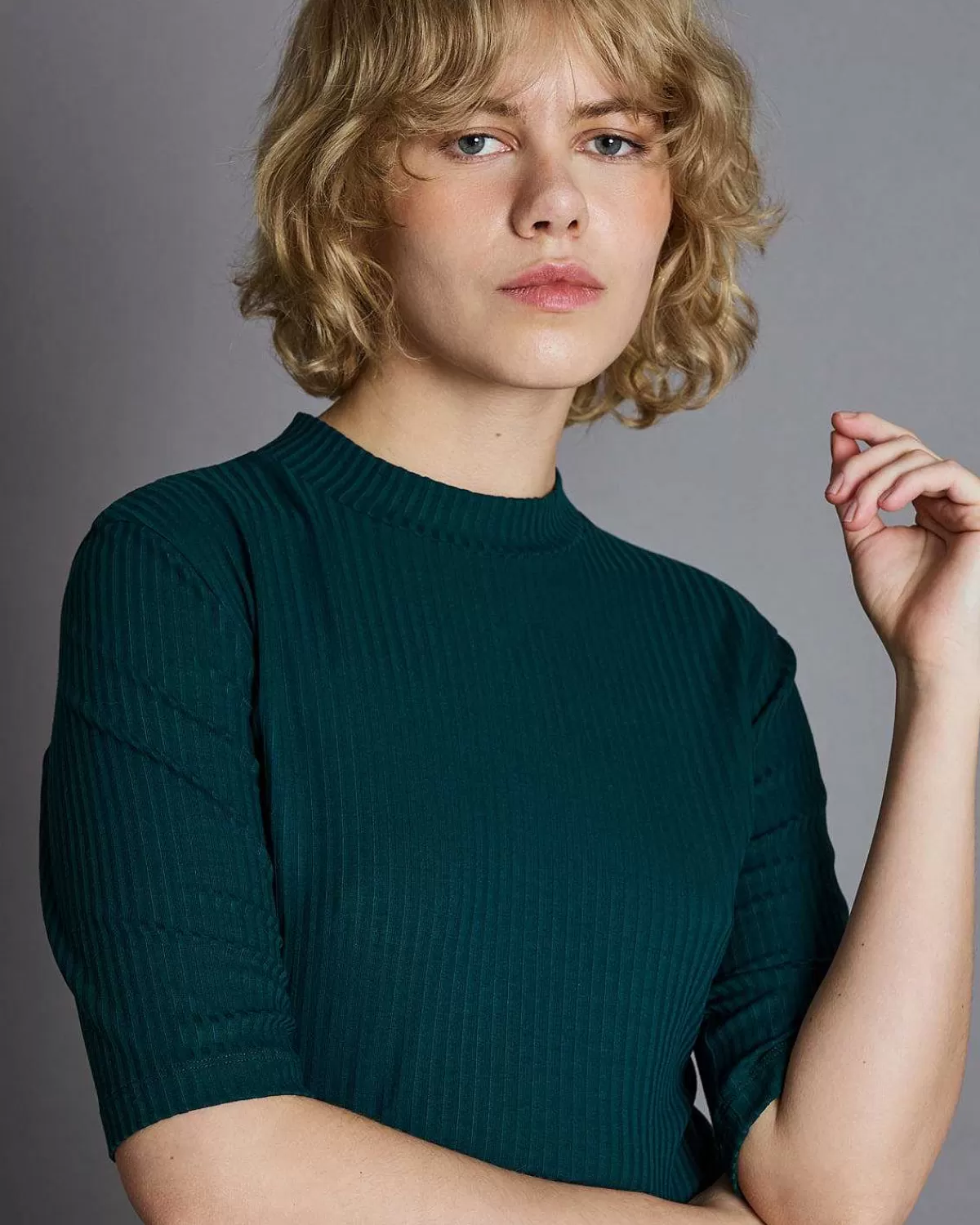 Deshalb Präsentieren Wir Voller Stolz Das T-Shirt Nina. Es Ist Aus Einem Flexiblen Und Bequemen Tencel™-Rippstoff Gefertigt, Der Sich Perfekt An Deine Körperform Anpasst. Nina Hat Einen Kleinen Rollkragen, Ist Ziemlich Tailliert Und Hat Ärmel, Die Kurz Vor Dem Ellenbogen Enden.